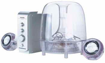 图中这款多媒体音箱很容易让人联想到科幻片,里面的物品总是那么稀奇古怪,而且很漂亮。这款麦博A-6351音箱采用了独立的功率放大器,而低音单元和卫星音箱皆采用了透明设计,且造型奇特,非常漂亮。价格仅380元。