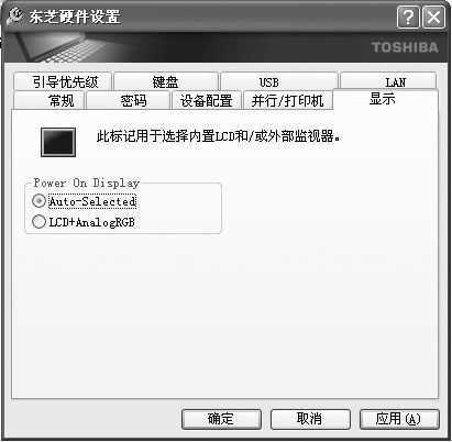 本本要实现外接显示器功能,首先需要在BIOS中打开此功能。以笔者的东芝A10为例,只要进入BIOS设置中,找到“DISPLAY”选项,把外接显示器功能打开,一般设置为“Auto-Selected”即可。由于目前很多品牌的笔记本电脑都提供了在Windows下管理BIOS的程序,只要安装相关组件就可以直接在Windows下进行简单设置。如笔者在东芝A10上安装了东芝硬件设置软件后,打开该程序进入到“显示”设置面板,就可以打开外接显示器功能(图1),非常方便。