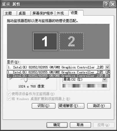 如果显卡采用的是Win2000或WinXP的默认驱动,则没有提供双屏和扩展显示功能,还需要安装显卡的最新驱动程序。笔者的东芝A10采用了Intel 8285/8255 GM/GME芯片组,集成显卡,安装了最新驱动程序后,在显示属性中可以看到支持两个显示器设备(图2)。选择第一个主显示器设备,点“高级”按钮进入图形属性设置面板,在“设备”选项中提供了四个功能设置(图3):“监视器”是用来设置外接显示器的参数的;“笔记本电脑”是用来设置本地液晶屏的显示参数的;“Intel Dual Display Clon”是用来设置双屏显示的;而“扩展桌面”主要针对不同用户在不同显示屏上显示不同的内容,也就是说可以在笔记本电脑液晶屏中显示一个桌面,而在外接显示器上显示另外一个不同的桌面,对于普通用户,此功能不是很常用。