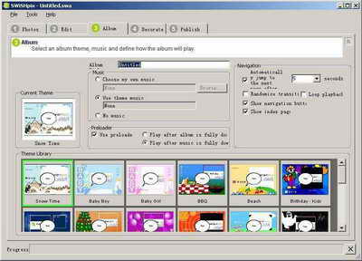 想用Flash做电子相册,却苦于不会Flash?现在不用担心了,用SWiSHpix,只要简单的几个步骤,就可以让你轻松制作出漂亮的Flash电子相册。软件内置20多套精美漂亮的模板,并可根据个人喜好进行修改。操作简单,但制作出来的效果绝对可以让你眼前一亮。