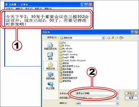 (2)输入好后选择菜单“文件→保存”命令,在弹出的对话框里设置好文件的名称“重要会议提醒”,再选择一个恰当的位置保存,如在“我的文档”中。