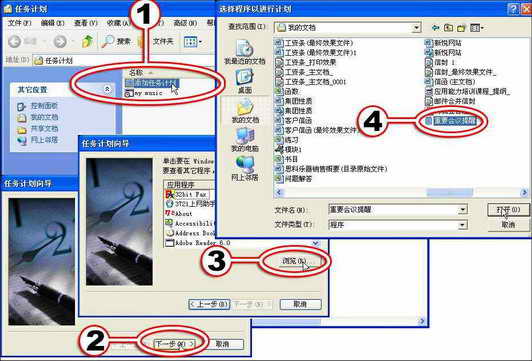 任务:假设每周礼拜三下午2:30,有一个例行的重要会议要参加,我先制作一个提醒参加该会议的文本文件,然后使用任务计划向导“告诉”计算机,让它每周三下午2:00打开这个文本文件,提醒我准时参加会议。