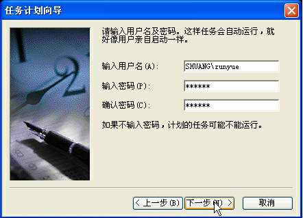 单击“下一步”后,向导要求输入密码(图4),这里密码的含义即为前面提过的用户账户密码,一定要输入,否则计划的任务不能运行。密码输入后单击确定,再单击“完成”即可。