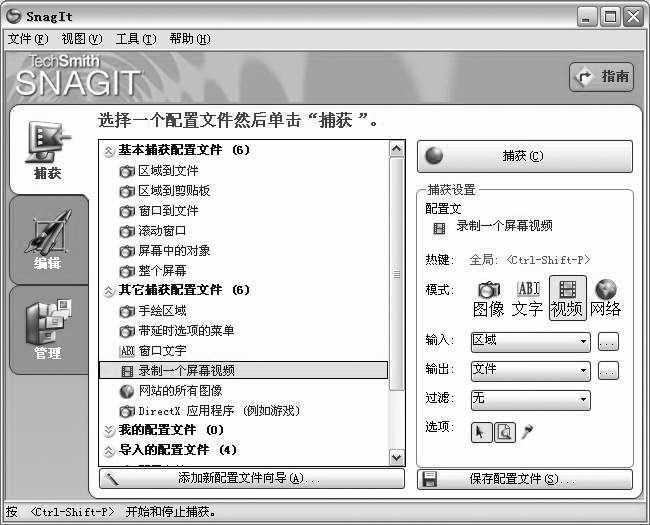 运行SnagIt7,选择“录制一个屏幕视频”(图7)。按下捕获热键“Ctrl+Shift+P”,用鼠标在视频区域画出SnagIt的录制区域,松开鼠标一会儿便弹出录制信息提示框,没有问题的话便点击“开始”录制视频。再次按热键“Ctrl+Shift+P”便能暂停或停止录制。停止后用点SnagIt打开预览窗口,播放满意后,便可将录制的视频保存为文件。