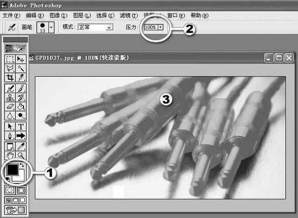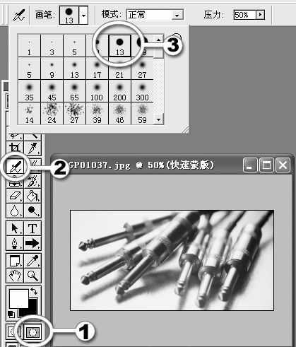 1.启动Photoshop,在工具面板中点快速遮罩,接着选取喷枪工具,在喷枪工具的属性控制面板中选择一个合适大小的实心笔头。