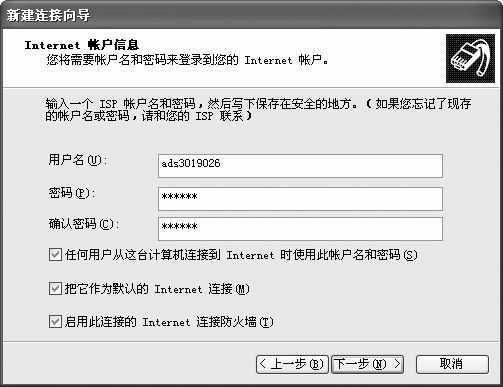 第四步,在打开的窗口中输入ISP名称,比如“我的ADSL”,单击“下一步”;接着,依次输入用户名、密码、确认密码(图1),另外,还可以设置是否启用Internet连接防火墙,将该连接设为系统默认的网络连接等,单击“下一步”;下面如果选择“在我的桌面上添加一个到此连接的快捷方式”复选框,这样就可以在桌面创建“我的ADSL”快捷方式,单击“完成”即可。