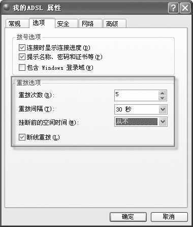 使用ADSL拨号上网,让M牛又是欢喜又是忧,欢喜的是可以感受下载极速,忧的是因为经常掉线没有收到QQ中MM的留言。为此,M牛苦心钻研,终于找到应对的方法:首先,打开ADSL拨号连接窗口,单击“属性”按钮;接着,在打开的窗口中选择“选项”选项卡,在“重拨选项”区域中(图3),选中“断线重拨”;然后在“重拨次数”中设置重拨的次数,比如5次;在“重拨间隔”中设置每次重拨的时间间隔,比如设为30秒;在“挂断前的空闲时间”中可以设置挂断拨号连接前的等待时间,可以选择默认的“从不”。最后,单击“确定”按钮,这样下次再掉线的时候,拨号连接会每隔30秒自动重拨。