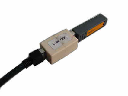 第2步,将连接配线架和集线设备的接插软线从交换机中拔出,插入RJ-45对接口的一端,另一端插入NetTool适配器(图6)。
