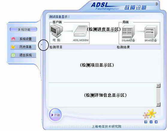 笔者在此向大家推荐一款ADSL宽带故障诊断软件(ADSL PC客户端诊断软件,下载地址:http://www.shanghaitelecom.com.cn/kd/TOOL/soft/AdslFaultDiagnotor-win2000-031114.exe)。
