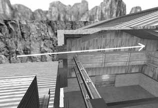 3.de_nuke实战中一个使用频率非常高的穿透位置是T在出基地后爬上房顶,然后对准对面的铁墙射击,目的是打击仓库里面在屋梁上防守的CT。这里特别要提的是CT最左边那根屋梁在T这一边对应的是左数第三根铁条的位置(图5、6),最右边那根屋梁对应的是T爬上岩石后正对着的铁条位置(图7、8)。