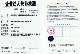 记者在飞舞网络的网站上看到其出示的企业营业执照(副本)扫描图片,注册号是4400002003584,法定代理人周媛,注册资本50万元,企业类型:有限责任公司,经营范围:数据库及互联网服务、电信增值服务、计算机软硬件研发销售、国内物资供销业,营业期限:1999年1月13日至2017年1月13日,是由广东省工商行政管理局于2002年7月23日颁发的,在企业法人年检情况一栏中盖的是2001年度年检专用章。