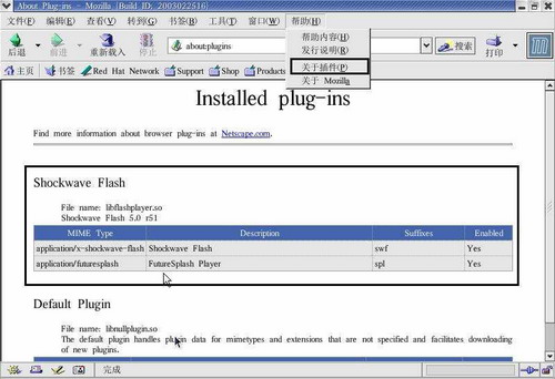 运行Mozilla浏览器,点击主菜单栏的“帮助→关于插件(P)”选项,在浏览器中查看Flash插件是否安装成功,如果在你的列表中多出 “Shockwave Flash”这项(如图),就说明Flash插件安装成功。