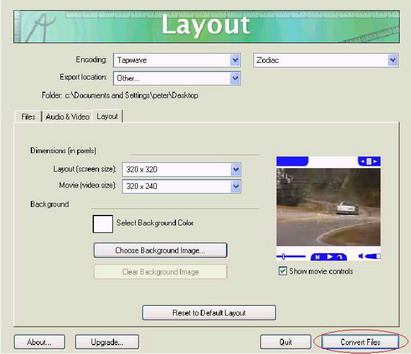 2.在Kinoma主界面的“Layout”页面中,还可修改与播放界面有关的设置(图2),如播放画面的大小、背景等。最后按右下角的“Convert Files”按钮,开始进行转换。