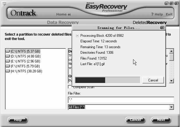 在默认情况下,EasyRecovery Professional将对所选的分区执行一次快速扫描,使用已存在的目录结构查找已删除的目录和文件。如果文件损坏的症状很严重,那么你要选中“Complete Scan”执行完全扫描。扫描完成后,你所要做的就是找到你的数据,尽情恢复就是了。利用这种方法,还可以恢复U盘的数据。