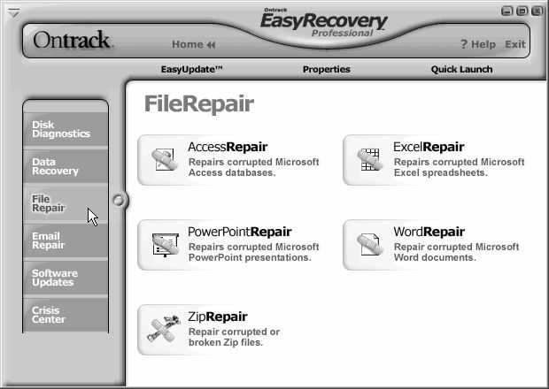 启动EasyRecovery Professional后,点击“File Repair”键,如图3所示。它的内容还挺丰富,有修复Mdb文件的“Access Repair”、修复XLS文件的“Excel Repair”、修复PPT文件的“PowerPoint Repair”、修复DOC文件的“Word Repair”和修复ZIP压缩文件的“Zip Repair”等。