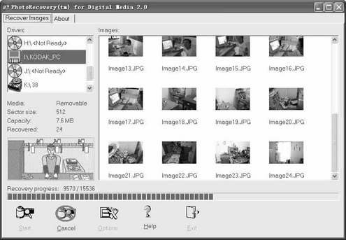 MediaRecover的使用很简单,首先将你的存储卡插入读卡器,然后启动MediaRecover,如图4所示,点击Recovery,在右边的界面选择读卡器的盘符,然后点击“Next”按钮进入下一步,设置恢复的相片的存放位置,设置好就点击“Next”进入扫描界面,点击“Start”按钮后,稍等一段时间,它就会帮你把丢失、误删除/格式化的相片给救回来。