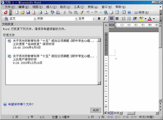 如果你使用的是Word XP/2003,而且已激活“自动恢复”功能,那么当Word遇到应用程序错误或系统故障时,再次打开程序时将自动分析并处理文件错误,然后尝试恢复数据,并且会将恢复的文件保存下来,这样我们就可以来找回重要的DOC文档了。