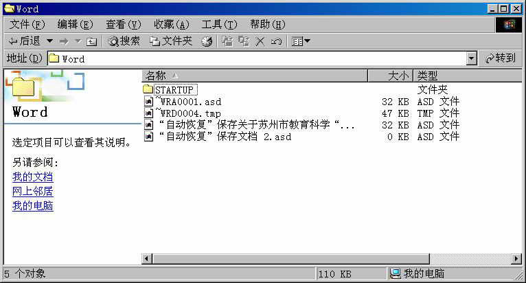 进入存储自动恢复文件的文件夹,Windows 2000/XP操作系统是在C:\Documents and Settings\<用户名>\Application Data\Microsoft\Word;如果是Windows 98操作系统,通常是在C:\Windows\Application Data\Microsoft\ Word,如图2所示,在这里可以找到文件名包含“自动恢复保存”字符的*.asd文件,双击即可在Word程序中打开。