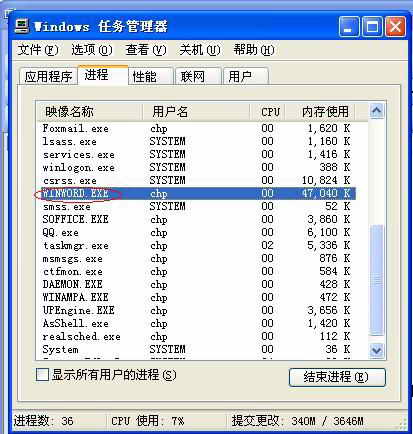 以Word 2000为例,如果出现“非法操作”提示框。首先,按下Ctrl+Shift+Del打开“Windows任务管理器”,在“进程”选项卡中查看是否有“Winword.exe”进程(如图)。如果有,选择该进程,单击“结束进程”。接着你可以打开Word,这时会显示自动恢复的文档,你可以选择最近的保存记录。