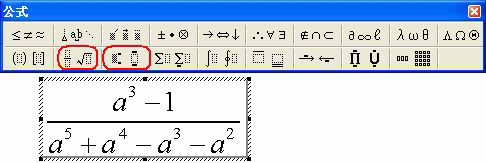 Step2:单击“公式”工具栏的“分式和根式模板”按钮,在随后弹出的下拉列表中,选择一种合适的分式模板样式;将光标定在分子上,输入字符“a”,然后单击“下标和上标模板”,选中“上标”模板样式,输入字符“3”,按一下右方向键,输入字符“-1”。