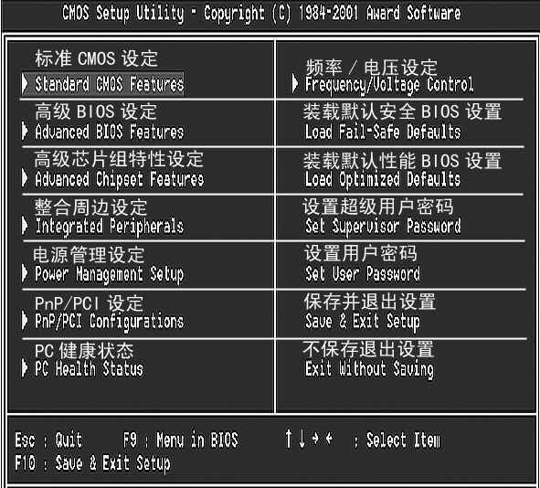 进入BIOS后(图2),我们可以看见有很多选项供操作,不同的主板设置项目数量不尽相同,有些主板会增加一些特色功能设置,不过以下基本的14个项目它们都具备。下面就以最常见的Award BIOS为例,讲解具体的设置方法。