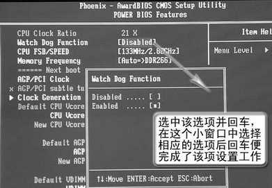 通过键盘上的“←”、“↑”、“→”、“↓”四个方向键,就可以在不同设置项目上移动。移动光标到所需要的设置项目,然后按下回车键即可进入该设置项目的详细设置子窗口中(图3),选定某个选项后,按回车便可。当用户将光标移动到不同的选项时,屏幕的下端会出现一行辅助信息,从而帮助说明该设置项目的大致功能。
