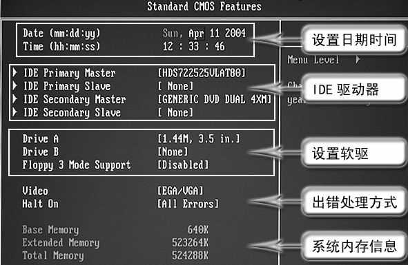 “Base Memory”(基本内存)、“Extended Memory”(扩展内存)、“Total Memory”(内存总量)等三个选项显示的是当前系统的内存信息,我们可以通过检查以上显示的内存信息判断内存是否正确安装,容量是否准确。