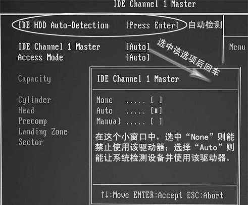 将光标移到一个IDE设置选项上,按回车键进入其设置画面(图5)。其中“IDE HDD Auto Detection”选项表示如果用户执行该选项,则系统会自动搜索该IDE接口上的设备。