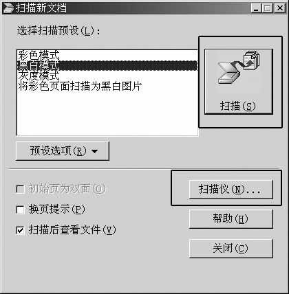 如图1所示,缺省的扫描预设为“黑白模式”,按每英寸300点进行单色扫描,这种模式非常适合扫描白纸黑字的文本页面或素描,扫描速度最快,而且生成的图像文件也比较小;如果是扫描全色图片或图纸,那么选择“彩色模式”比较好,此时会按每英寸300点进行彩色扫描,扫描速度较慢,而且生成的图像文件也比较大。