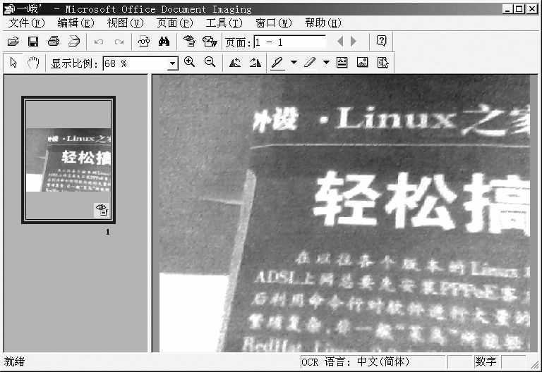 扫描结束后,程序会自动打开Microsoft Office Document Imaging,我们可以在这里看到刚刚扫描得到的图片(图2),虽然效果不是那么理想,但也还可以接受,选中一段文本,复制后就可以粘贴到Word或记事本中进行处理。虽然由于轻松版摄像头像素不高的原因,造成部分文本无法正确识别,但笔者已相当满意了。