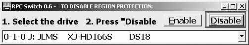 另一种方法是无须刷新FW,使用特定的软件即可。下面以建兴和SONY为例,看看是如何解决区码限制的。首先下载“Rpcde2”这款免费软件(http://perso.club-internet.fr/farzeno/dvds/rpcde2.zip)。使用它很简单,解压运行后选择你的DVD光驱,然后单击“Disable”按钮(图1),就可以除掉RPC-2保护了。目前该软件支持Liteon 163/D、166S、165H、122及SONY的1211、1611、1612,还有华旗的DVD-16X3H,其他的DVD破解FW可以在http://forum.rpc1.org/dl_all.php下载。笔者的建议是:有直接修改RPC的软件就尽量不要刷新FW!
