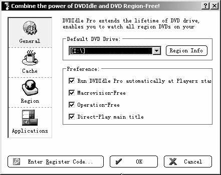 第三行是Region区码项,软件默认已经是修改为全区码了,我们就不必再改了。第四项的Applications程序项中,DVDIdle已经列出了支持的DVD播放软件,还需要将它们“绑定”:单击“Add”添加按钮,再选择播放程序即可。