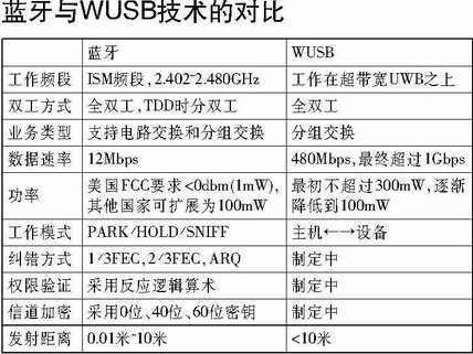 按技术原理来讲,蓝牙和WUSB均属于小范围的个人网络通讯。最初,蓝牙依靠通讯质量和速度打败了红外线传输技术。但是随着人们日益增加的通讯速度要求,12Mbps的蓝牙通讯速度逐渐不能胜任多媒体、宽带等各项应用;而覆盖范围达到2米、通讯速率达480Mbps的WUSB正在展现实力。