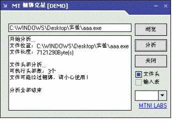 对于我们这些电脑初学者来讲,上述方法还显得过于繁琐和复杂。近日,一款名为“木马捆绑克星”的软件就较好地解决了这个问题,而且它还是个绿色软件。它的工作原理也是分析程序文件头标志,但使用方法十分简单,双击mviewap.exe文件启动木马捆绑克星后,首先点击界面右侧的“浏览”按钮来选择需要检测的EXE文件,接着再点击“分析”按钮,分析结果很快就会出现在左侧界面中。