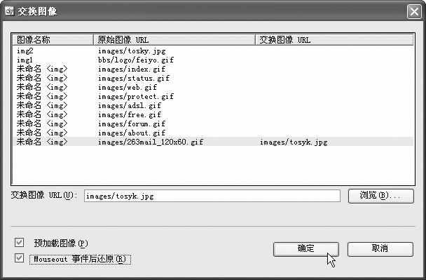 “交换图像”行为可以实现图片的交互性,当鼠标经过图片时,图片可以暂时被替换为其他图片,如果在设置交换图像时勾选了“Mouseout事件后还原”(图3),鼠标滑出时图片还会恢复原样,增加了页面的生动感。