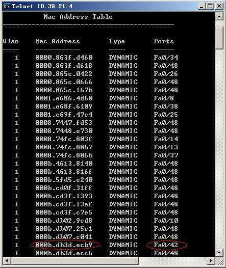 提示:如果MAC地址所对应的端口是交换机的级联端口,那么你只能放弃这个交换机,在下一台交换机上重复以级操作,直到找到用户端口为止。