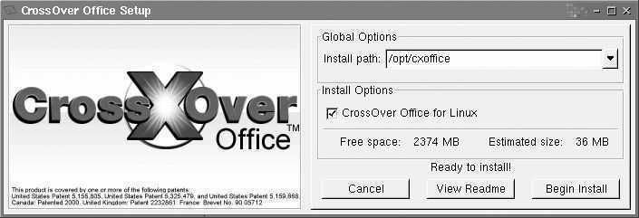 下载后是一个名为office.tar.gz的压缩包,执行tar xvf office.tar.gz命令将它解压缩后,运行install-crossover-office-2.1.0.sh,在“install path”中添加:/opt/cxoffice,在“install Opition”选项的“CrossOver Office For Linux”前打钩,点击Begin Install开始安装(图1)。
