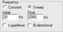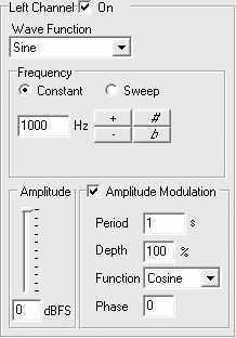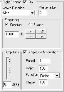 (4)中间的两个大框分别为左右声道设置(图3、4)。Wave Function内可以选择多种波形。Frequency内的Constant为恒定频率,下面为数值。选Sweep后可自设频率。在右声道设置中多了Phasere Left项,可填入数值,表示右声道的相位,即与左声道的发声时间差。