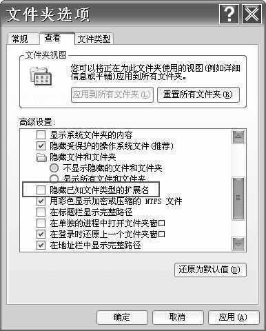 有朋友可能会说可以通过升级固件(Firmware)、扩展功能来解决这个问题,但经过我网上的搜索,三星官方到现在都还没有推出可以实现此类功能的固件升级包,而且也没有找到民间发布的固件升级包,即使找到,升级固件也存在一定的危险性。于是我想了一个折中的方案:更改音频文件扩展名,“骗”过MP3播放器实现音频文件的传输。具体的做法是这样的:首先依次打开“开始菜单”→“控制面板”下的“文件夹选项”,然后选择“查看”,将“隐藏已知文件的扩展名”选项前的对钩去掉(如图),然后那些音频文件的扩展名就露出“原形”了,选取你需要传输的文件,用鼠标右键单击“重命名”,然后随便起一个扩展名(如xyz)代替原来的音频扩展名即可,不用管系统的警告提示,因为我们还会把它改回来的。