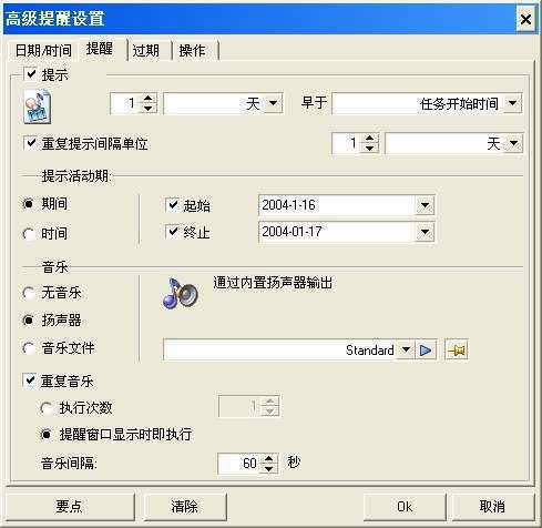 选中“日期”复选框,可以在下拉列表框中设置事件发生的日期和时间;选中“提前提醒”复选框,可以设置提前提醒的时间,你可以选择按分钟、小时、天、周进行提醒。如果你还有更高的要求,可以打开“高级提醒设置”对话框进行设置(图2),这里还可以设置提示时是否需要播放音乐等。