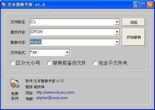 软件下载后(http://www.skycn.com/soft/16291.html),无须安装即可使用。首先点击“浏览”按钮选择文件所在盘符或目录,分别在“查找内容”、“替换内容”栏目中填入相应的内容,然后选择文件格式(支持TXT、HTML、ASP、VB等格式文档),再点击“开始替换”就可以了,如图所示。
