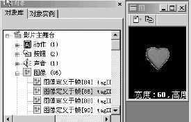 2.从文件中打开你所需要修改的Flash动画,可以看到在“对象库”下表中影片的各种元素都显示出来了,然后“双击图像按钮”影片中的各个图像就会依次展开,点击每一帧图片,图片内容就会在右侧窗口中显示(图1)。