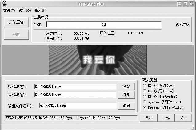 启动TMPGEnc.Plus,在视频源和音频源处分别添加刚才制作的音视频文件,最后设置输出文件后点“开始压缩”按钮生成合成后的文件(图1)。