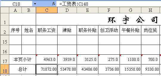 4.选中第10个(最后1个)工作表,将下面空白行中的公式清除掉,然后在下面增加一行(如果打印不下,可以将上面空白行删除1行),在A18单元格中输入“总计”字符,在C18单元格中输入公式“=工资表!C148”,并用“填充柄”将公式复制到D18至O18单元格中,直接调用“工资表”中的“总计”数据(图2)。