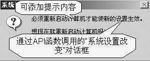 运行后将调用系统的“设置改变”对话框,如图1所示。如果在你的软件中加入这个功能,便可以实现关机或者重新启动等功能了。