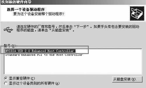 Win2000系统 首先安装SP4补丁,然后单独安装厂商提供的USB2.0驱动程序,一般可以从主板安装盘中找到。安装完成后重启电脑,系统会发现新硬件设备,选择“显示已知设备驱动程序的列表,从中选择特定驱动程序”并单击“下一步”,接着在硬件向导中选择“NVIDIA USB2.0 Enhanced Host Controller”(图2)安装USB2.0总线控制器,安装成功以后打开设备管理器,如果在“Universal Serial Bus Controllers”USB总线控制器内出现“NVIDIA USB2.0 Enhanced Host Controller”和“USB2.0 Root Hub Device”那么就说明安装成功了(图3)。
