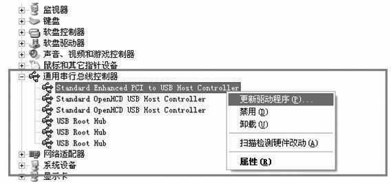 WinXP系统 首先请升级SP1补丁,然后再单独安装USB2.0驱动,然后重启系统,WinXP会报告发现新硬件,并进行自动安装。安装完成后打开设备管理器,然后我们发现仍然没有识别USB2.0控制器,还得手动解决它:打开“通用串行总线控制器”,在“Standard Enhanced PCI to USB Host Controller”上点击鼠标右键,选择“更新驱动程序”(图4)。接着在“硬件更新向导”界面内选择“从列表或指定位置安装”,单击“下一步”,再选择“不要搜索,我自己选择要安装的驱动程序”一项,最后单击“下一步”,在显示兼容设备栏内选择“NVIDIA USB 2.0 Enhanced Host Controller”进行安装,安装完以后系统会提示继续安装“USB2.0 Root Hub Device”,使用同样的方法安装即可,至此WinXP下USB2.0驱动算是安装完了。