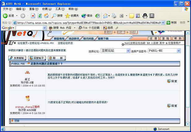 例如,我们进入主板论坛,在右上角“选择产品型号”下拉列表框中选择自己所使用的主板型号,这里无论是最新的P4P800 Deluxe或是早已“作古”的P2B、TX97-E等都可以找到,如上图所示,提出问题后很快就能得到在线工程师的解答。