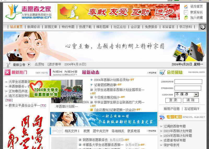 在“五四”青年节来临之际,虫虫推荐中国青年志愿者协会主办的“志愿者之家”(http://www.wew.cn)网站。在这里我看到,“到祖国和人民最需要的地方去”并不是一句空话,许多风华正茂的大学生选择了做志愿者的方式回报社会。让我们更多地关注他们的世界。