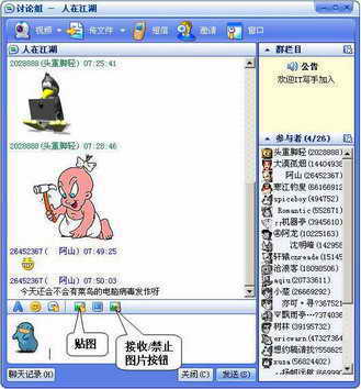 群内的贴图和自定义表情功能绝对会使聊天的趣味性增加不少,不过如果觉得太热闹了,也可以禁止接收图片,点击输出栏上面最右边的那个按钮就行了(图2)。